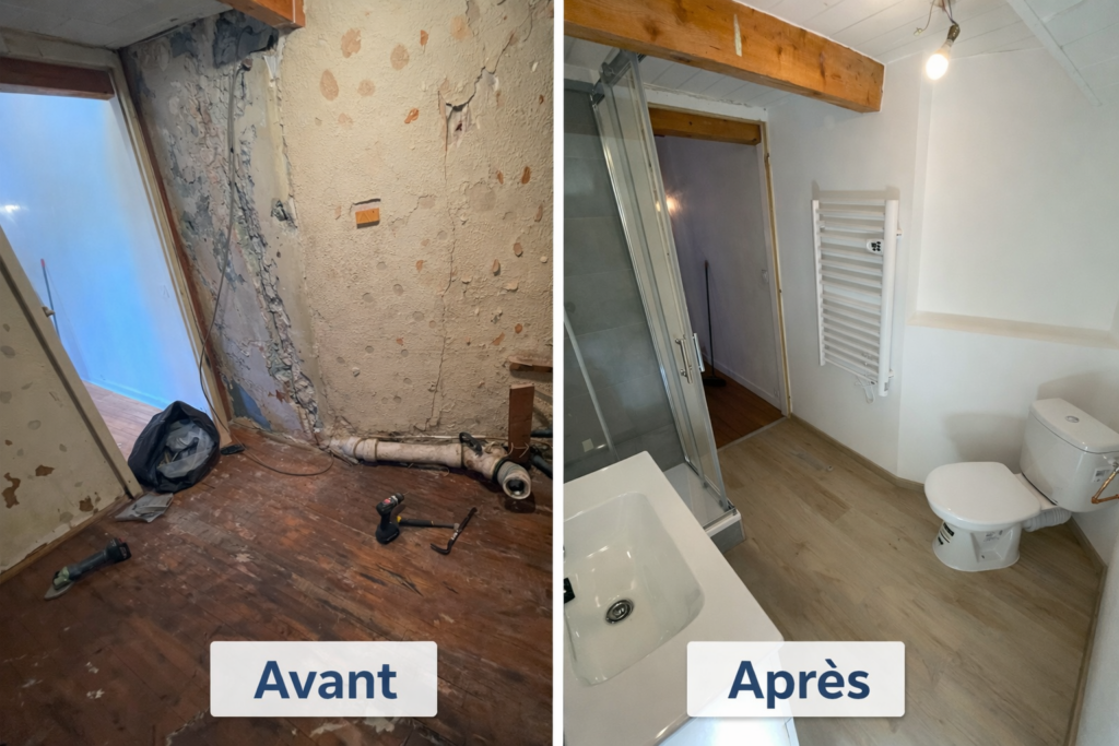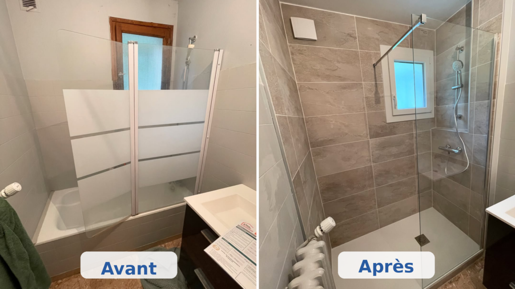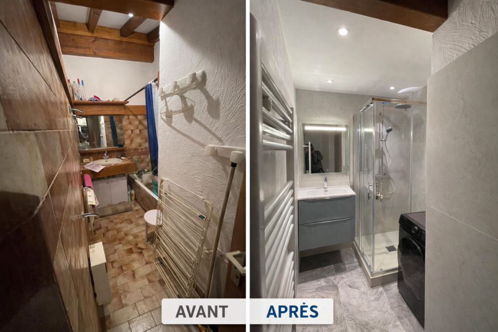 Transformation nette : douche moderne, vasque suspendu, ambiance contemporaine.